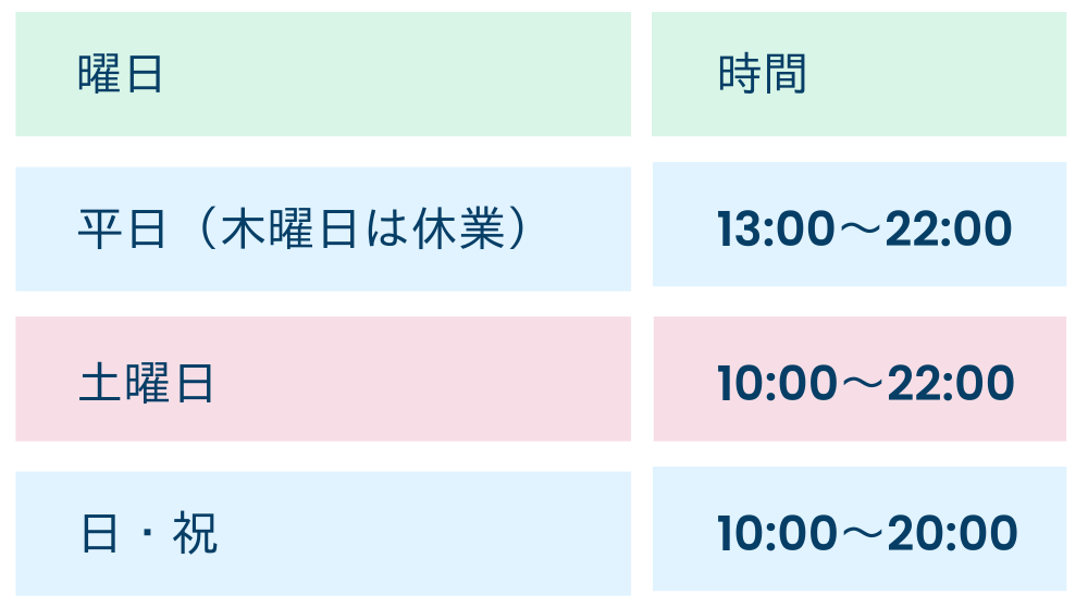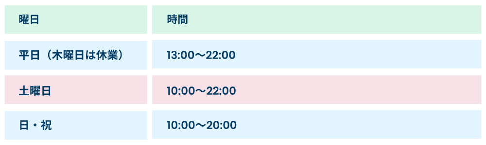 ※お盆・年末年始・GW期間などの特別営業期間は変更する場合があります。